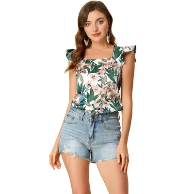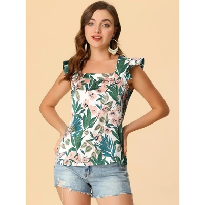 Soft and lightweight chiffon creates this comfortable tank top with a cap-sleeved cut, a deep square neckline, and a relaxed bodice. Tropical printed flowers add a vacation-inspired phenomenon to this simply designed top. The ruffled cuffs around the strap make this piece sweet and elegant. Pair it with high-waist shorts, or jeans, or dress it as an overlay for your fresh holiday outfits.