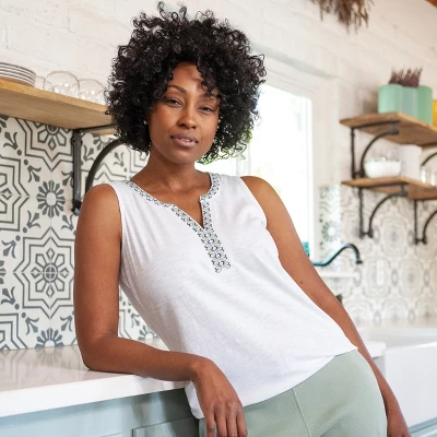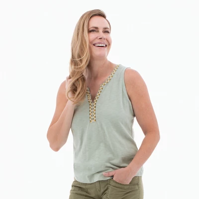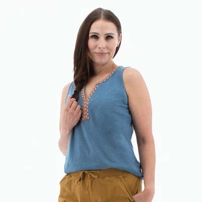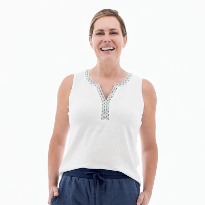 A much-loved Aventura summer style is back, but this time as a tank top. Ladies, please meet your new favorite: the Kateri Tank Top. While gorgeous style is the first thing to grab your attention, the amazing, eco-friendly fabric of this top will surely win your heart. A blend of Better Cotton Initiativeâ„¢ Cotton and TENCELâ„¢ Modal makes this top soft, breathable, and low-maintenance with an easy drape. These fibers are also better for the earth by reducing the precious water and energy resources needed to produce them. The cherry on top is the fun, flirty, and simple styling, punctuated with tri-colored geometric embroidery around the split neck, that makes this an easy piece to match.