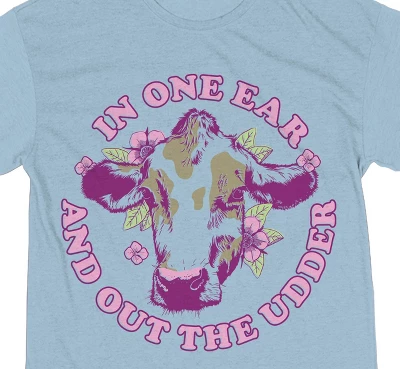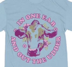 - CUSTOM DESIGN: A cow head decorates the front of this graphic tee while purple letters around the image spell out, “In One Ear And Out The Udder.” Cow fans will love the fun custom design on this night shirt.