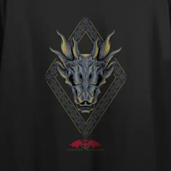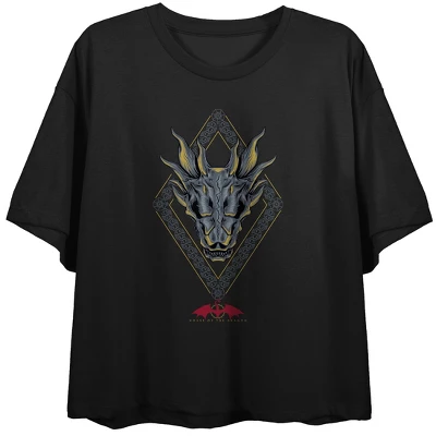 - GRAPHIC DESIGN: A dragon head appears in front of a gold diamond shape in the graphic design on this crop tee while red letters below spell out, “House of the Dragon.” Fans of the fantasy series will love this cool design.