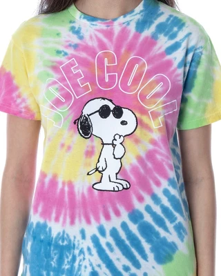 This shirt is an officially licensed Peanuts Snoopy Joe Cool skimmer tee. Joe Cool is one of Snoopy’s alter-egos. He first appeared in a Peanuts comic strip in 1971. As Joe Cool, Snoopy pretends to be a college student. To become Joe Cool, the beagle puts on a pair of sunglasses, leans against a wall, and says his name is Joe Cool. As the name suggests, Joe Cool believes he is really cool, somewhat like James Dean or Fonzie from Happy Days. Joe Cool is printed on the front of the tee with his name Joe Cool arched over him. The skimmer style cut adds a youthful feel, and the tie-dye color spiral makes it far out. Perfect for fans of Peanuts or Snoopy.