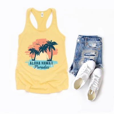 Looking for a cute versatile top to wear this summer? Make sure to grab one of our Aloha Hawaii racerback tanks! This soft and comfortable graphic tank is the perfect top for any outfit. It can be paired with biker shorts, jeans, or even a simple skirt/dress! This tank is true-to-size, so be sure to order your regular t-shirt size! If you are looking for a more oversized look, make sure to size up!