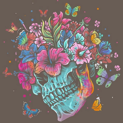 - Blossom into your spooky self with this Halloween design featuring a skull covered in rainbow flowers and butterflies fluttering happily.