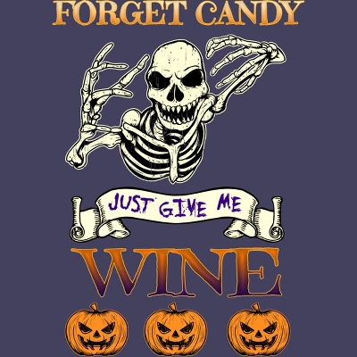- Have a spooky night with friends with this awesome design featuring a skeleton and jack-o-lanterns with the text “Forget Candy Just Give Me Wine”.