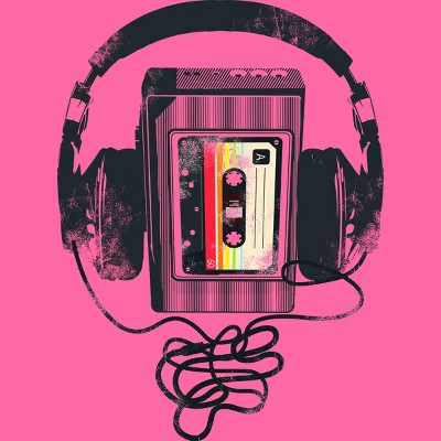 - Travel to the past with this retro design featuring a black and white cassette player listening to its own jams with over the ear headphones.