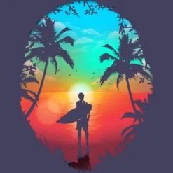 - This design featuring a silhouette of a surfer on a colorful palm tree filled beach, overlooking the sun setting on the ocean with a sky filled with clouds and birds is the perfect summer time fanta-sea!